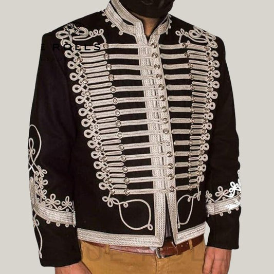 Men's Military Hussar jacket for men black wool with silver braiding detailing's | Unique design | Blue Rolls Bespoke